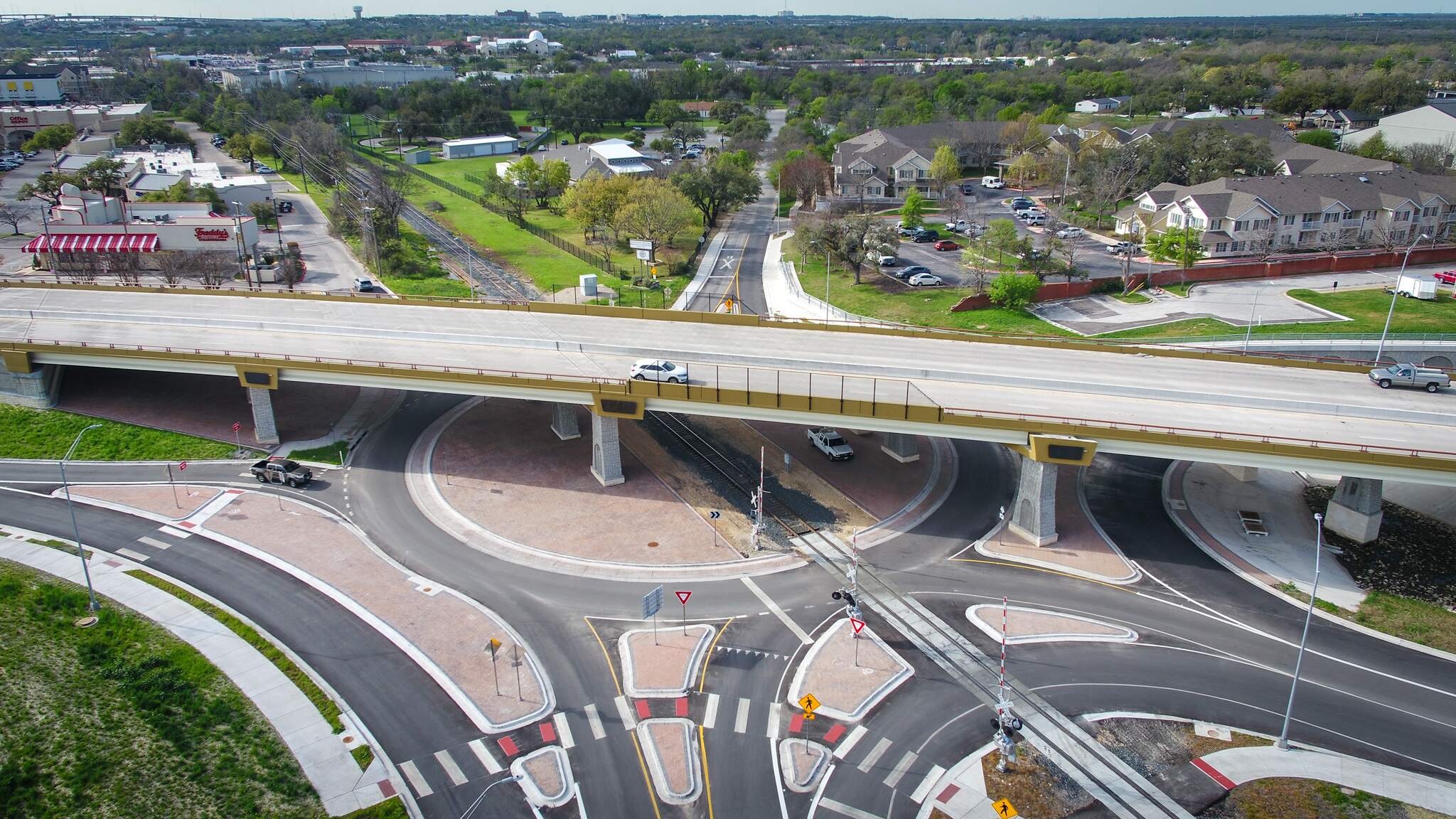When posed with a challenging six-legged intersection at Chisholm Trail Road and two at-grade railroad crossings, the design team developed a unique and innovative solution by designing an at-grade roundabout intersection with the railroad tracks crossing through the middle and a bridge handling 90% of the traffic to span all of it. The design team worked with the city to realign the roadway to the south to minimize traffic disruption during construction and repurpose the two existing rail crossings to serve as the eastbound and westbound crossings of the roundabout.